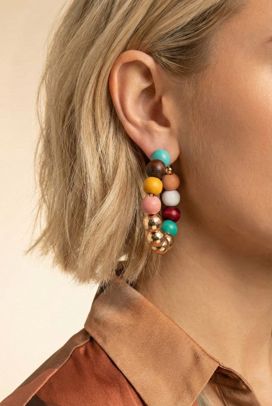 Statement hoop earrings crafted with a harmonious mix of matte wooden beads, polished gold-tone accents, and faceted metallic elements. The warm neutral tones are balanced with subtle pops of green, brown and deep red, creating a modern yet earthy aesthetic. Lightweight and visually striking, these hoops add texture, color, and effortless sophistication to both casual and elevated looks.